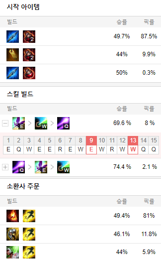 스킬 빌드로는 E W Q 순으로 마스터 해줍시다.