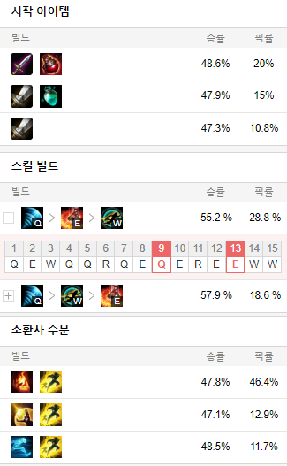 스킬 빌드로는 Q W E 순으로 마스터 해줍니다.