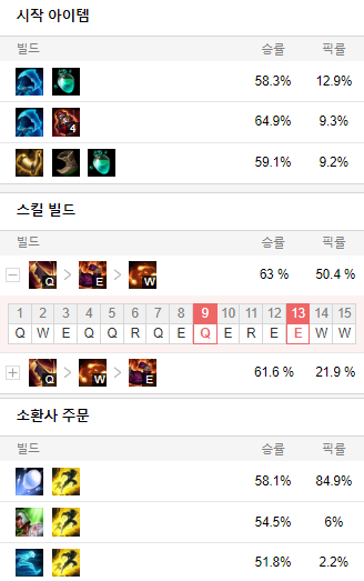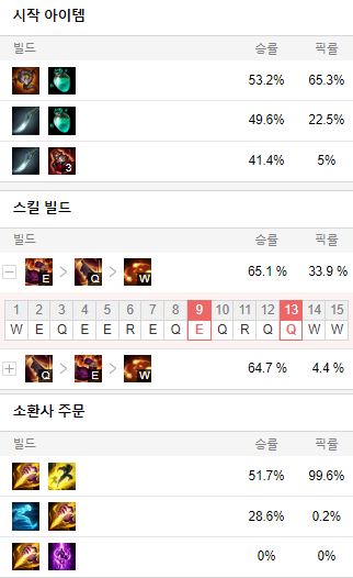 스킬 빌드로는 E Q W 순으로 마스터 해줍시다.