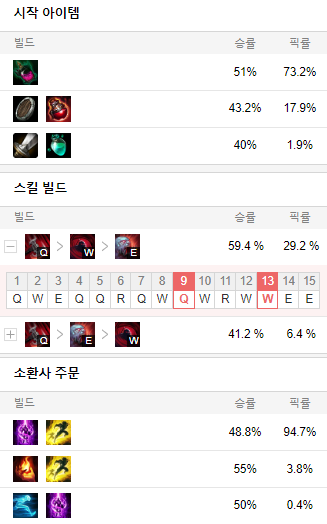스킬 빌드로는 Q W E 순으로 마스터 해줍시다.